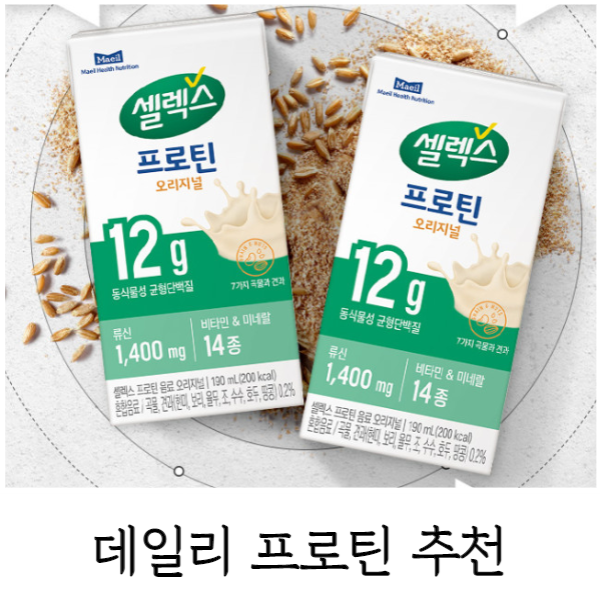 가장 인기 있는 제품은 셀렉스 프로틴 오리지널인데요 190ml로 24개에 약 2만원 초중반대 하더라고요. 개당 천원씩 정도라고 생각하면 커피보다 훨씬 낫죠? 단백질과 류신, 비타민D가 풍부하게 들어있는게 특징입니다.
