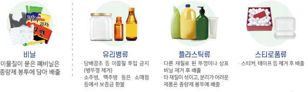 - 음식물이나 오염된 부분이 있으면 일반 쓰레기(종량제 봉투)로 배출해야 합니다.